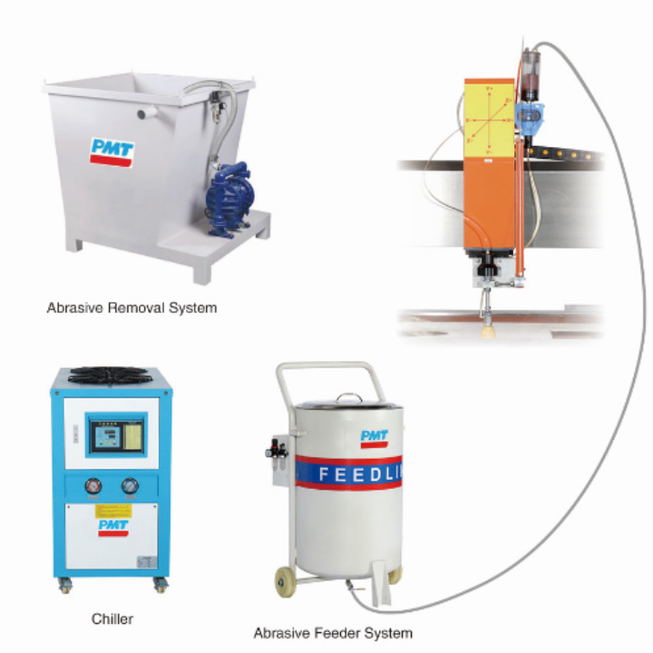 طاولة القطع بنفث الماء PMT مُجهزة بإطار نقل محسّن يشمل صواريخ توماهوك X وY وZ، وخزان مياه، ورأس قطع، وإطار تشحيم، وإطار قيادة مؤازر.